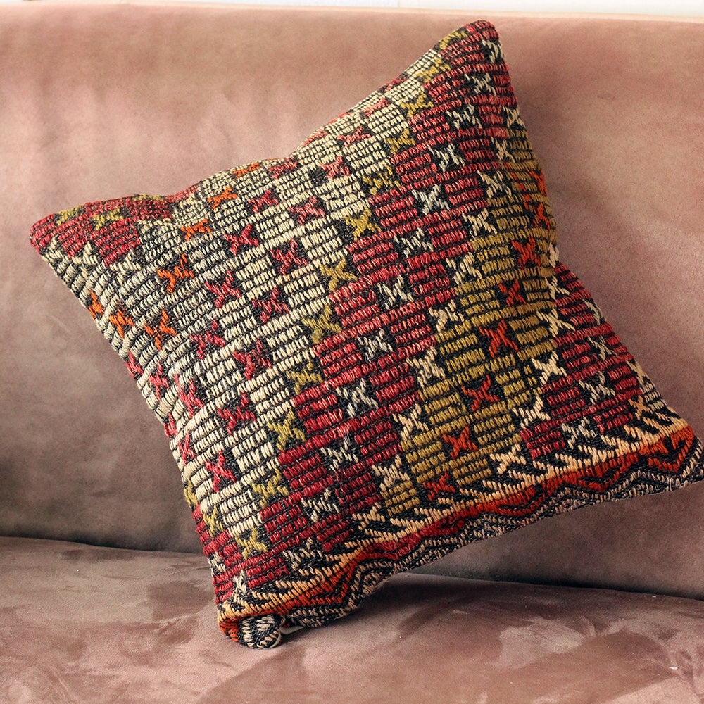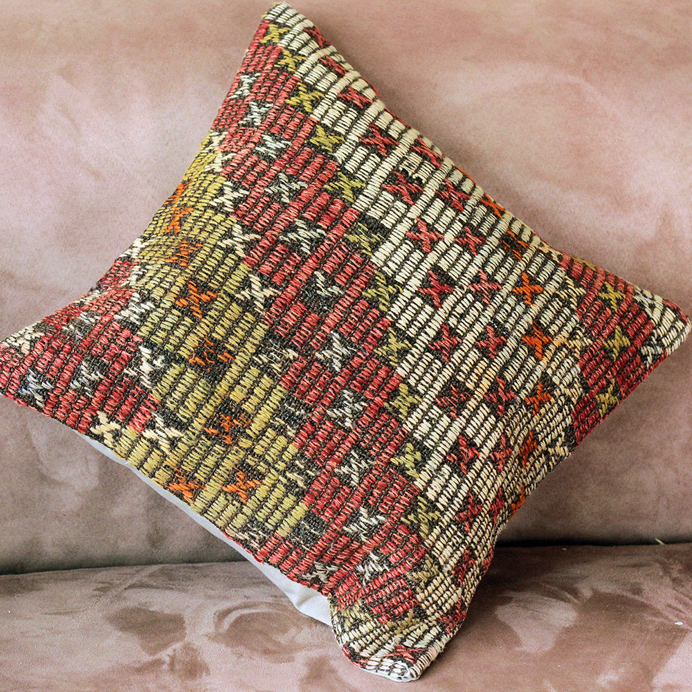 Give a unique and bohemian touch to your home decor. As our colorful madeathand Kilim pillow covers are made of original Kilim rugs, the front side is an authentic handwoven design of 100% wool. Kilim rugs are crafted in Turkey using natural fibers and dyes. They come in different designs depending on the region of production. Boasting this authentic Kilim pillow offers a beautiful way of incorporating a bit of Turkish history in your home.